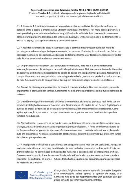 Q1: A Indústria 4.0 está incluída nos currículos das escolas secundárias. Geralmente na forma de